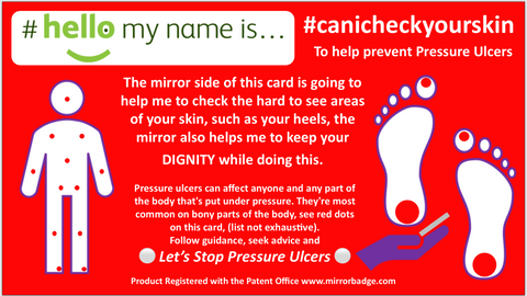 We thank Chris Pointon for his permission to use the #hellomynameis logo on our mirror badges. The Mirror Badge and the Shatterproof Mirror Cards have always been designed for care givers to check patients skin to prevent pressure ulcers, but we really feel we all should be saying “hello my name is” before any care is carried out, especially such an Intimate procedure as a skin inspection.